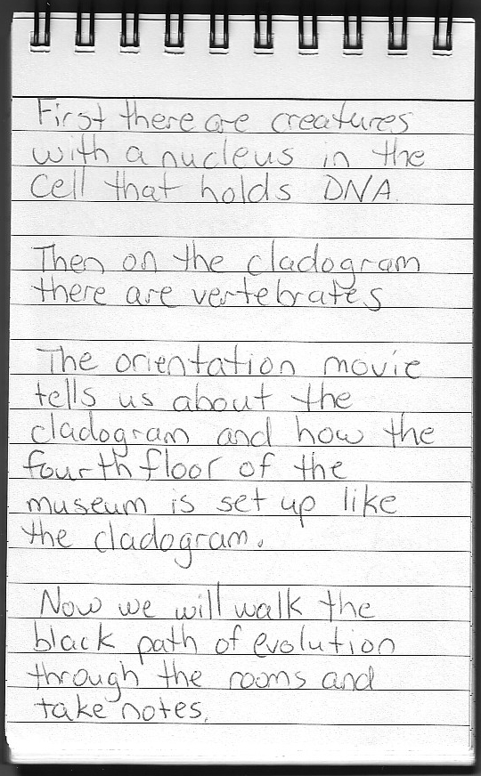 First there are creatures with a nucleus in the cell that holds DNA. Then on the cladogram there are verbetrates. The orientation movie tells us about the cladogram and how the fourth floor of the museum is set up like the cladogram. Now we will walk the black path of evolution through the rooms and take notes. |