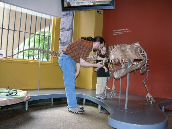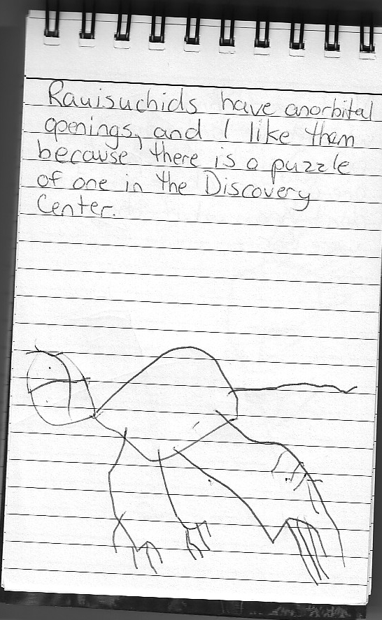 Peo looking at the museum's model of antorbital openings. Peo drawing a rauisuchid in her evolution journal. Peo working on the rauisuchid puzzle in the Discovery Center with a museum volunteer. Peo working on the rauisuchid puzzle alone. Peo and Daddy working on the rauisuchid puzzle. |