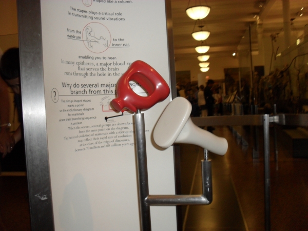 Next came another room that started with a stirrup-shaped stapes in the common ancestor of Epitheres. The stapes is a middle ear bone that transmits sound vibrations from the ear drum to the inner ear which lets you hear. When the large dinosaurs died, lots of early mammals had this kind of ear bone, like horses, porpoises, marmots, tigers, and hogs. |